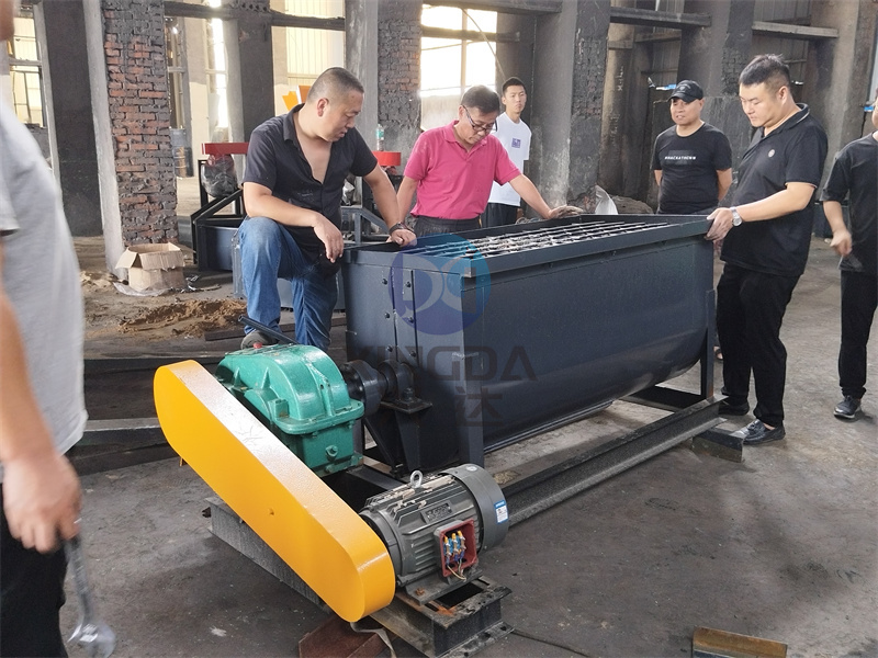 臥式攪拌機是整套有機肥生產線中的一款有機肥攪拌設備。在有機肥生產線中擔當起到攪拌物料的作用。臥式筒體內裝有旋轉反向的漿葉,漿葉成一定角度 將物料沿軸向、徑向循環翻攪,使物料迅速混合均勻。 臥式混合機由電機通過皮帶傳動到減速機帶動軸旋轉。 該系列臥式混合機是我公司研制的新一代混合設備,該 機混合度高,殘留量少,適合于兩種以上肥料,添加劑 預混料的混合,及配合飼料、濃縮飼料、添加劑預混飼 料等的混合。具體特點是:物料得到充分的混合,從而 提高了混合均勻度;采用新穎的轉子結構,減少 了物料的殘留量。該機的特殊轉子設計還能將較大的物 料破碎。總體結構更加合理,外型美觀,操作維修方便。