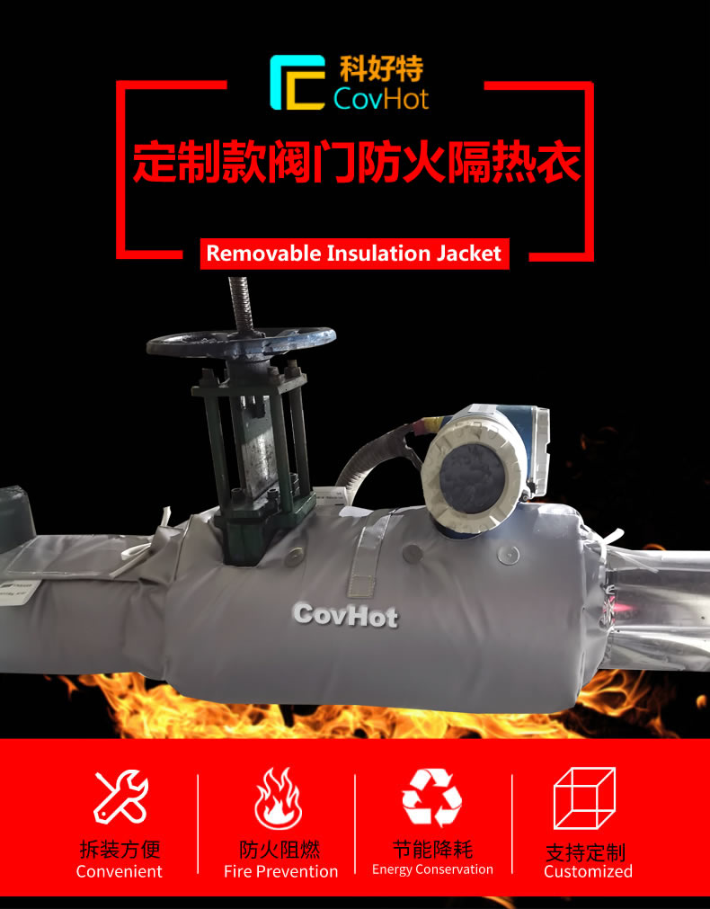 蒸汽閥門保溫是管線保溫工作的薄弱環節,雖然閥門所占面積不大,但由于保溫效果不理想,其散熱損失不可低估。科好特可拆卸蒸汽閥門保溫套采用非石棉耐高溫布做表層,內填充納米纖維,通過高強度耐高溫線制作而成。可以取代大部分傳統的以鋁皮隔熱效果優良,拆裝方便,可多次重復使用等優點。